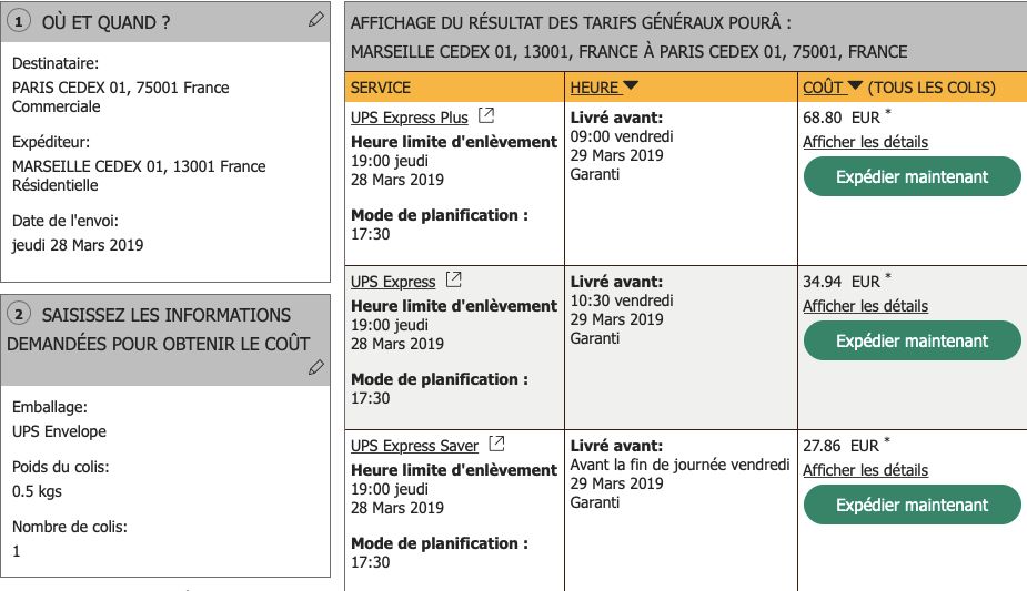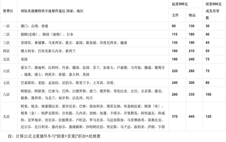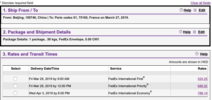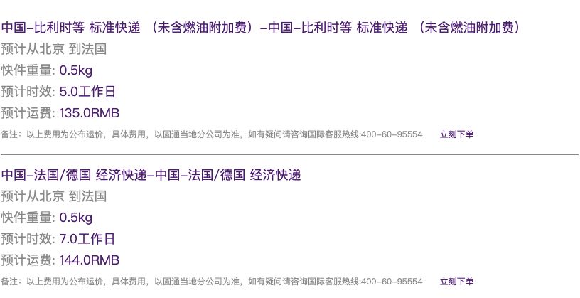 以下各个快递公司的数据参考均为北京寄到巴黎,文件重量为500克,快递费用会根据不同地区而有变化,以下数据仅作对比)