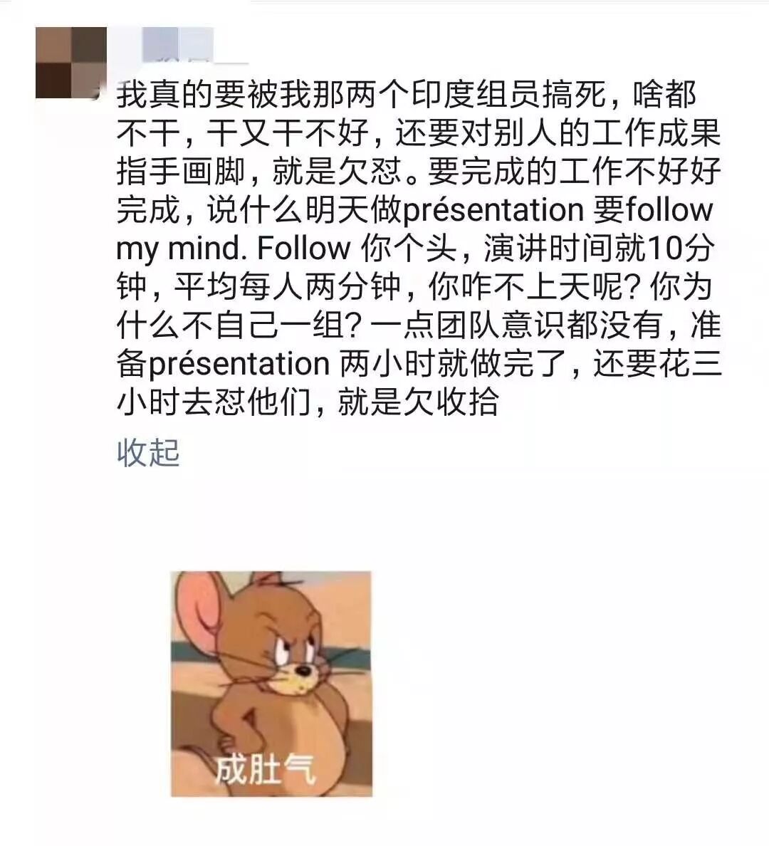 补充一下,真要跟猪队友斗智斗勇的时候别怂。我第一次遇到不干活的队友的时候只会头疼,然后多做一部分;后来也跟同组的法国朋友学会了硬刚:凭什么她什么都不做还要占据我们的劳动成果?甚至都可以把这种人剔除出去。