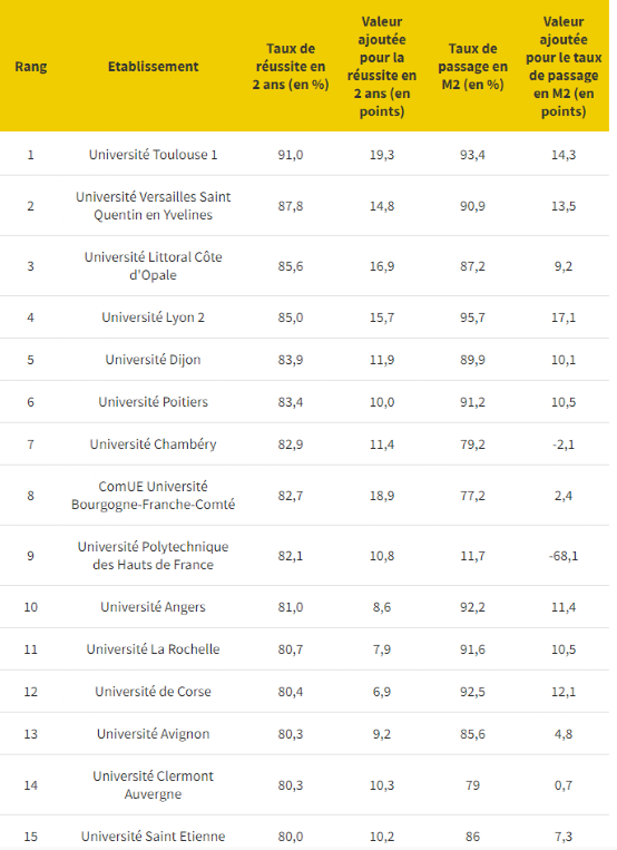 图卢兹一大的科学和健康硕士以毕业率 91%在排名中名列第一,接下来是凡尔赛圣昆汀大学(87.8%),然后是滨海大学(85.6%)。