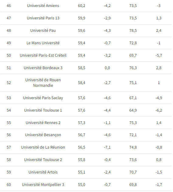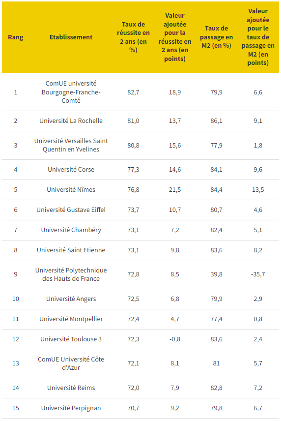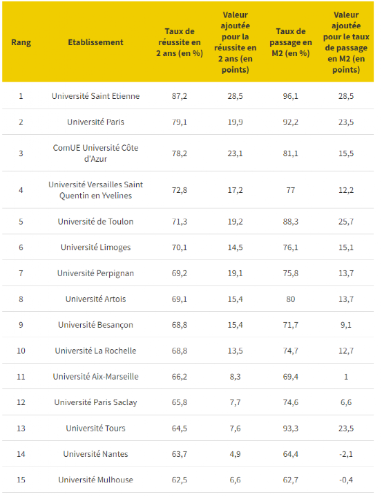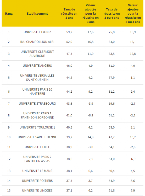 通过这份榜单,我们可以看到Licence阶段三年内毕业率最高的大学、全法68所公立大学毕业率排名的具体情况、以及具体细分学科领域的毕业率情况。这份排名主要调查的人群是从L1就开始在学校注册,然后在L3拿到毕业证的学生。而那些中途转进来再毕业的学生,不会被这份榜单统计入内。排名的数据包括:3年毕业率、3年毕业率期望增值、3/4年毕业率、3/4年毕业率期望增值。其中,期望增值(valeur ajoutée)是通过将“实际毕业率”减去“期望毕业率”来得到的。