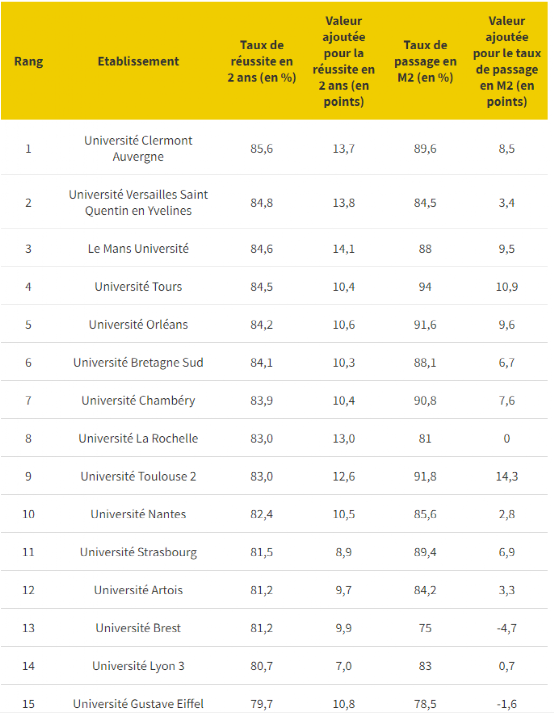艾克斯-马赛大学位居第一,毕业率达到91.7%。紧随其后的是勒芒大学85.7%和普瓦捷大学81.7%