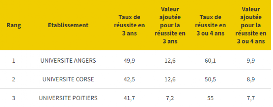 紧随其后的是科西嘉大学,有42.5%的学生三年内顺利毕业,50.5%的学生3或4年顺利毕业的成绩获得第二;本科毕业率第三名的是普瓦捷大学,三年内本科毕业率为41.7%,3或4年毕业率为55%。