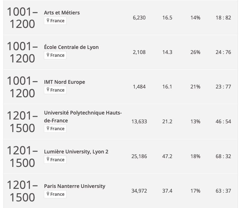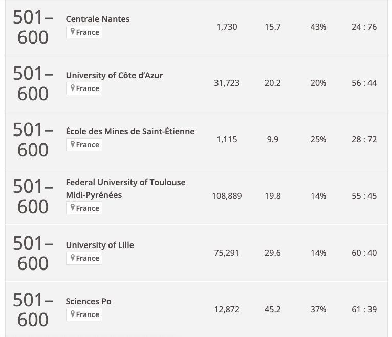 通过前200的院校我们可以发现,法国的大型院校或者院校联盟在泰晤士世界大学排名中更占优势。但是在排名前500的院校中,有一些较小型的院校,这些院校的实力可见一斑。