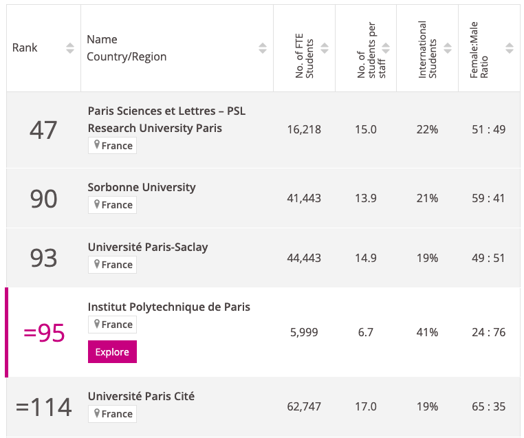PSL巴黎文理研究大学、索邦大学和IP Paris联盟的排名较为稳定。法国排名第一的PSL大学联盟组建于2010年,包含了11所学校,研究所,以及3个科研机。学校在工学、文学、理学、经济学和医学等多个领域拥有崇高的学术地位及广泛的影响力,在各大世界排名中领先。