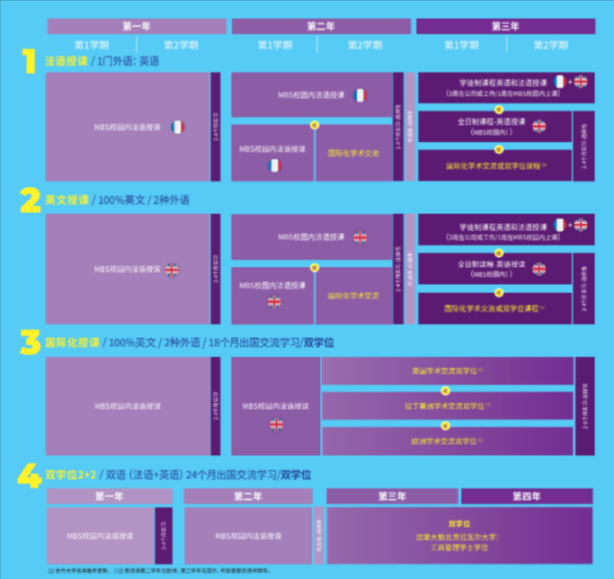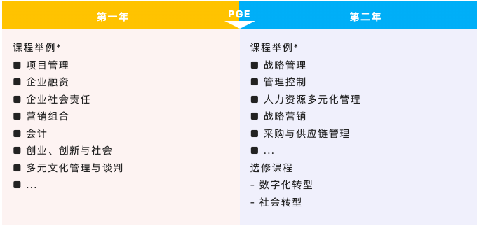 项目的授课语言可选英语或者法语,时长为2年或3年。第一年学习管理学的基本知识,第二年选择专业。在第一年和第二年之间,可以GAP一年进行实习,为第二年的学习做准备,第二年可以选择学徒制或者双学位。具体课程如下: