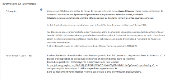 FLE/S : Appropriation, diversité, insertion图尔的要求是学生必须获得C2的语言水平,各项考试均需达到。同时,图尔要求了并行程序,这一点同学们一定要注意,如果不走并行程序的话,学校是不会受理我们的申请文件的。